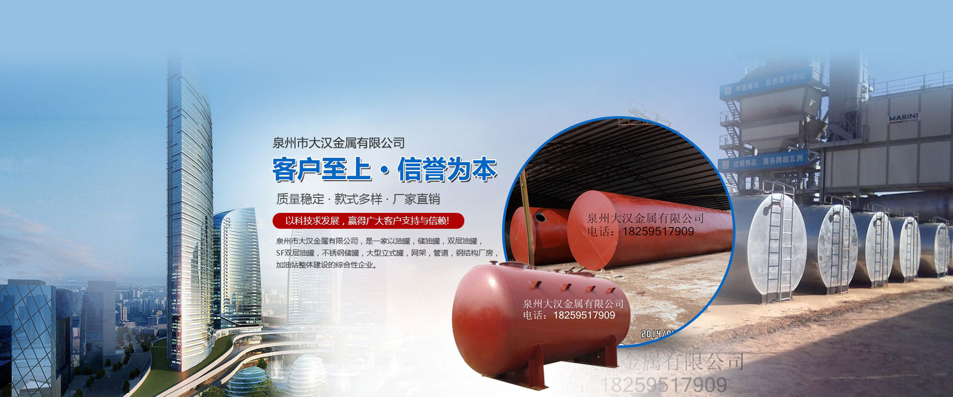 泉州市大漢金屬有限公司,是一家以油罐、儲油罐、雙層油罐、SF雙層油罐、不銹鋼儲罐、大型立式罐、網(wǎng)架、管道、鋼結(jié)構(gòu)廠房、加油站整體建設(shè)的綜合性企業(yè)。本公司以技術(shù)人員、施工經(jīng)驗(yàn)豐富的工程隊(duì)、自動化設(shè)備、擁有鋼結(jié)構(gòu)建筑、螺栓球網(wǎng)架設(shè)計(jì)安裝技術(shù)力量,嚴(yán)格按照國家容器標(biāo)準(zhǔn)制造,是一家產(chǎn)品開發(fā)并生產(chǎn)各種壓力容器和制造金屬結(jié)構(gòu)工程,化工石油工程安裝的大型企業(yè)。近多年來,以質(zhì)量穩(wěn)定、客戶至上、信譽(yù)為本,以科技求發(fā)展,贏得廣大客戶支持與信賴。